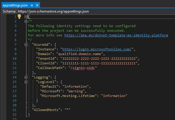 Get your TenantId and ClientId from the App Registration in the portal (see image above) and paste into the appsettings